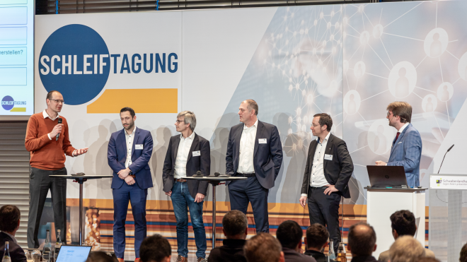 Der Fachkräftemangel war gleichzeitig ein Gegenstand der Podiumsdiskussion, die Tagungsleiter Jannik Röttger mit dem Fachbeirat der Schleiftagung führte. Auf der Grundlage einer vorherigen Meinungsumfrage im Plenum erörterten sie die Herausforderungen und Chancen, die gerade die gesamte Schleiftechnologie im deutschsprachigen Raum beschäftigten. Dazu zählen auch die Verlagerung bestimmter Teilbranchen der Produktion, wie der Elektromobilität, in den asiatischen Raum, die Automation und Digitalisierung von Schleifprozessen und die ökologische Optimierung von Fertigungslinien. Die Teilnehmenden konnten wertvolle Denkanstöße sammeln und setzten die Diskussion gerne in der folgenden Abendveranstaltung fort. Für eine heitere und kommunikative Stimmung sorgte dabei nicht zuletzt der Auftritt des Comedy-Redners Dr. Jens Wegmann, der die Gäste gekonnt und mit maßgeschneidertem Humor unterhielt.