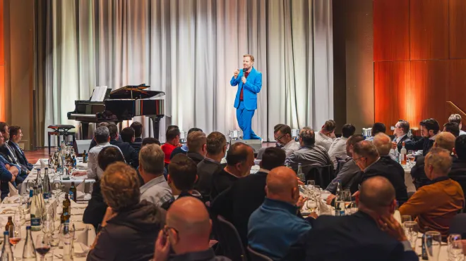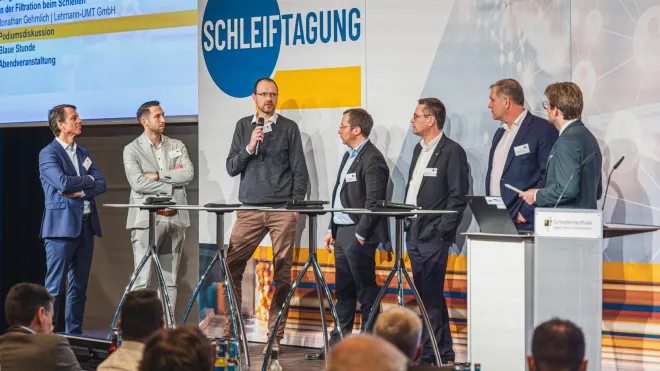Traditionell rundete die von Tagungsleiter Jannik Röttger moderierte Podiumsdiskussion das inhaltliche Programm des ersten Veranstaltungstags ab. Darin diskutierte der Fachbeirat der Schleiftagung gemeinsam mit Prof. Dr. Thomas Bergs die derzeitigen Herausforderungen und Randbedingungen der Schleiftechnik – immer mit dem Blick nach vorne, welche Chancen genutzt werden können, um trotz der Herausforderungen auf eine erfolgreichere Zukunft hinzuarbeiten. Abschließend fasste Jannik Röttger einen zentralen Aspekt auf, der auch in der vorhergehenden Meinungsumfrage ein klares Ergebnis war: Die Begeisterung der anwesenden Fachleute und Führungskräfte für die Schleiftechnik sei hoch und einer der stärksten Technologietreiber – „und genau das leben wir auf der Schleiftagung.“ Den Beweis für diese Aussage lieferte sogleich die folgende Abendveranstaltung, die Gelegenheit zur Weiterführung wertvoller Diskussionen in vertrauter Atmosphäre bot. Ein Auftritt des Comedians Patrick Nederkoorn sorgte für eine heitere Stimmung.